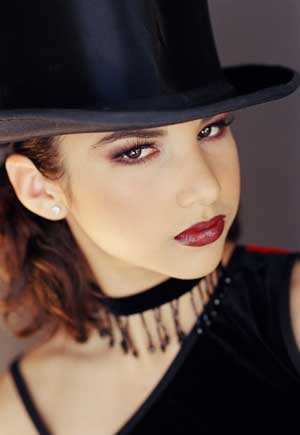 Glitz- If costume has a lot of glitz (rhinestones or sequins) add a little glitter to compliment costume color just at the center of the upper eye lid to look wet. A headband with a flower or feather at the side for Flapper or for Cabaret and Moulin Rouge choose a top hat to add drama. Bob wigs in black or platinum create the hair style of the day.