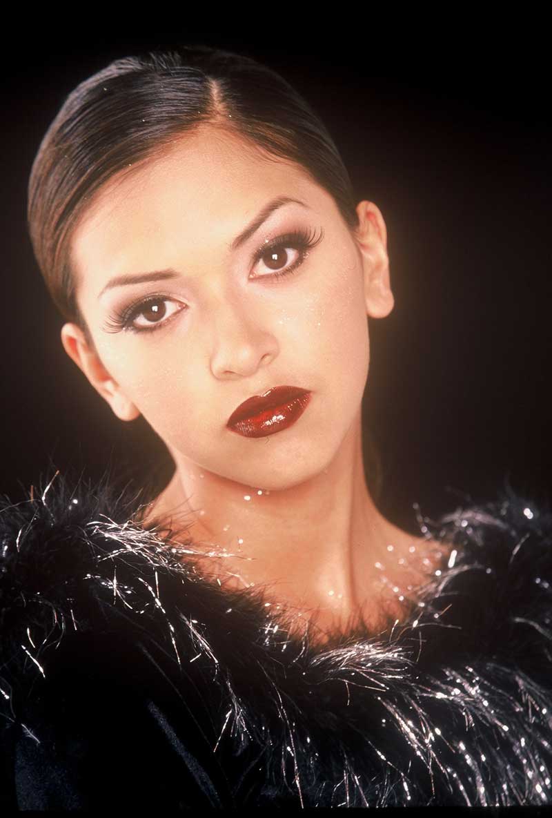Eyes- Every look needed for eyes uses Mode Dion 5 Color Pro Pallet. Define eyes in black/Drama eye shadow at outer lash corner sweeping up to above the crease blending over to the inner eye corner. To keep eyes looking open, do not blend onto center of lid. Keep the look rounded. These are not “Cat Eyes” but round “Doe Eyes”. Blend burgundy Define 2 eye shadow into the edges of the black above crease rounding eye from outer corner to inner corner. Wet Mode Dion Liner Brush, stir into black eye shadow and line across lid and below lower lash line creating a fuller line at the center of lower lashes. For a large stage apply white pencil onto lower lid and a little at the outer corner to make eyes appear even rounder. Finish lining by applying burgundy eye shadow dry on top of the black smudging more at the center of the lower lashes. Add a full row of black false lashes.