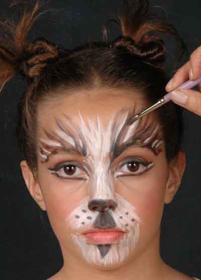 The featured look is a Tiger Cat. For wild cats like a Lion, keep it to three colors (brown, white, black). For a Tiger (orange, black, white) and for a leopard use two colors (black and white) to apply spots instead of stripes.