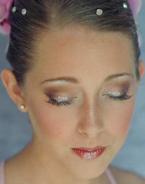 Where traditional ballet makeup is required keep in mind that the brows need a little more enhancement and extending. Eyeliner will need to be extended a bit further at the ends. Be sure to not meet the lower and upper lines at the sides. Click on highlighted products to view. This look features Mode Dion’s 5 Color Pro Pallet eye shadow. For a softer look use the eye shadow you define the eyes with (Define 2 Burgundy shown) as the eye liner below lower lashes and the black shadow/liner at the outer end of the eye corner along upper lashes. Keep eyes wide with white pencil in between. Add a little white shimmer like Mode Dion’s Shimmer Cream Pot to the center of lid, brow arch and inner eye corner to open eyes even more. False lashes will be a must to create big elegant eyes. Adding a bit of magical glimmer to the cheekbones and eyes can really create more enchantment. Use Diva Glue to secure glitter in opal/white Mode Dion’s Crystalina.